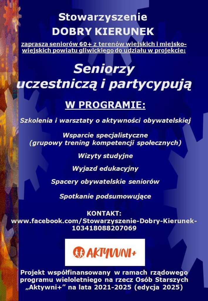Stowarzyszenie Dobry Kierunek z Taciszowa realizuje projekt pt. „Seniorzy uczestniczą i partycypują”. Celem głównym projektu „Seniorzy uczestniczą i partycypują” jest podniesienie poziomu kompetencji w obszarze aktywności obywatelskiej i wolontariatu wśród 40 seniorów 60+ na terenach gmin wiejskich i miejsko-wiejskich w powiecie gliwickim w terminie 01.03.2025-31.12.2025.